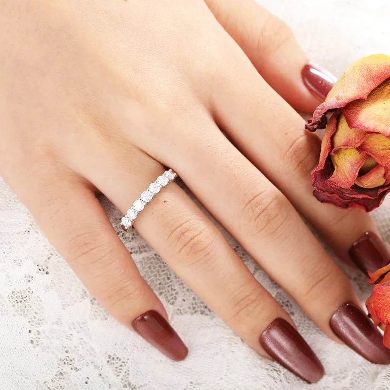 8 valoraciones en Anillos de boda de moissanita de 5 piedras, banda de media eternidad de corte brillante redondo, anillo de boda de diamante de laboratorio de plata 925 de 3mm para mujeres y hombres