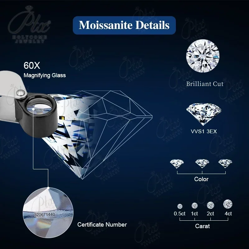 2. Todos los productos utilizan moissanita de alta calidad con color D y grado de claridad VVS1, que tiene un hermoso fuego y alta dureza. Son más brillantes que los diamantes y más asequibles que los diamantes.