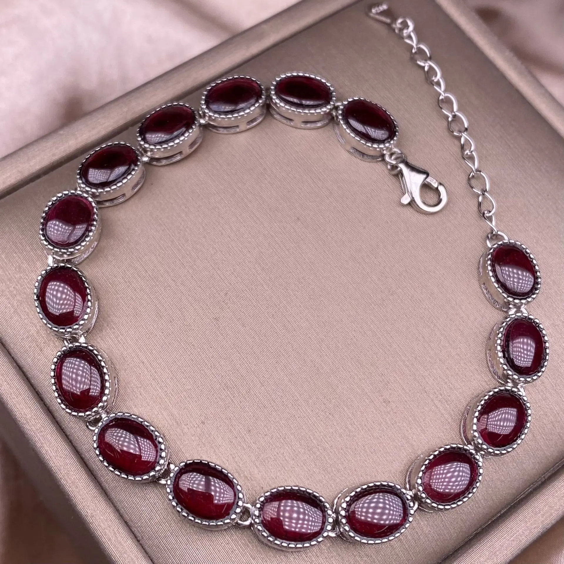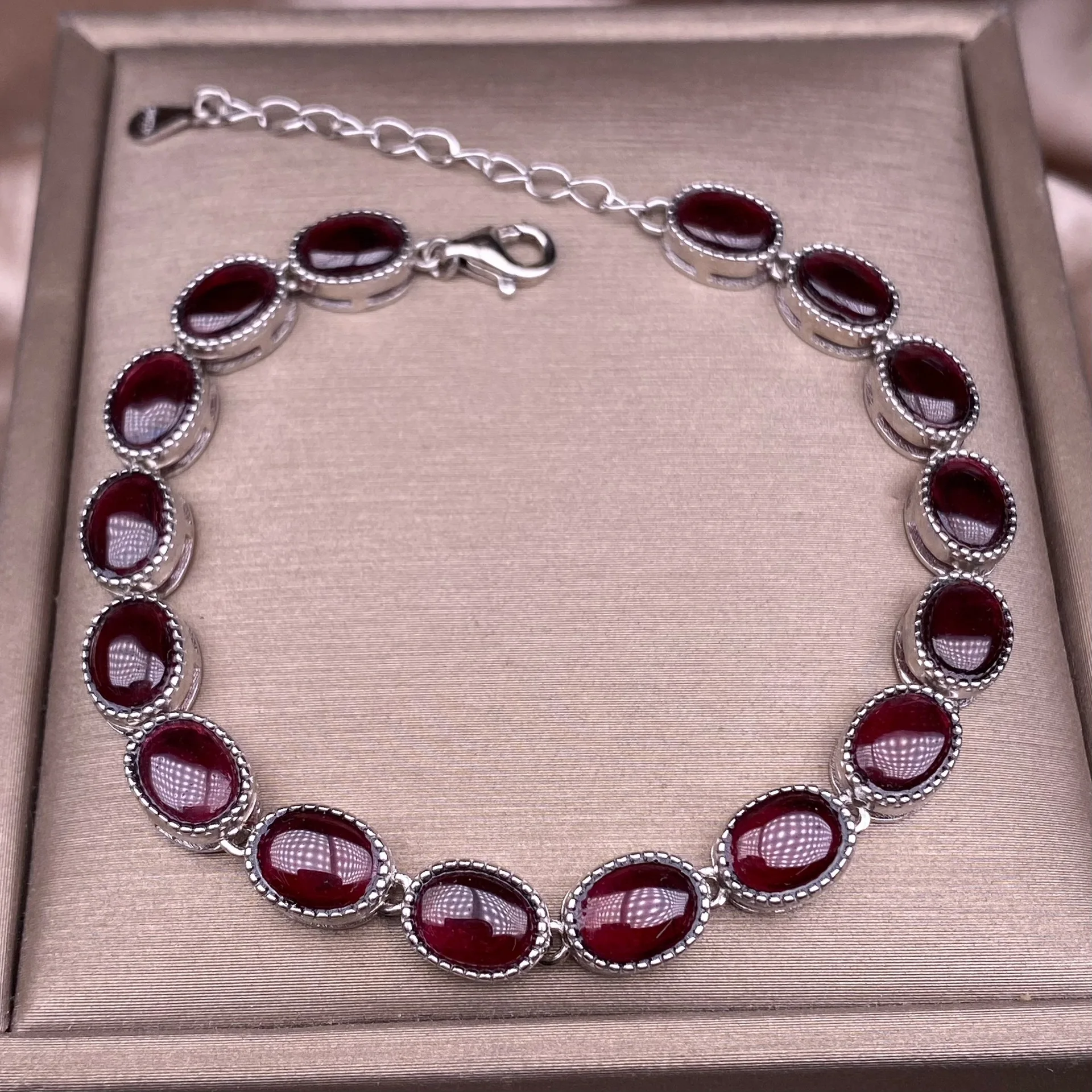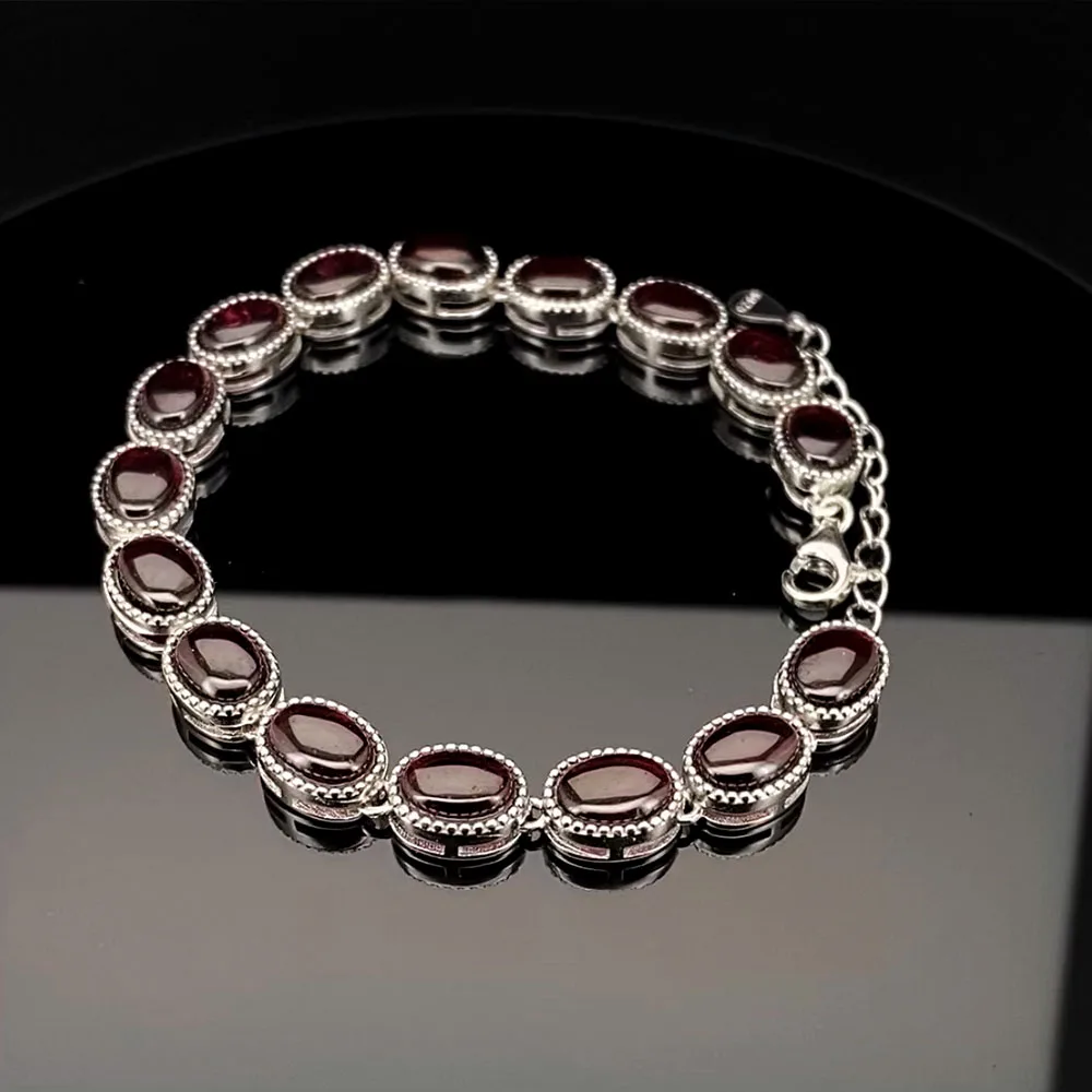 Esta pulsera está cuidadosamente elaborada con material de plata de ley 925 de alta calidad, con lÃneas de borde de plata suaves y delicadas que muestran una delicada artesanÃa.El granate elÃptico incrustado tiene un rico color rojo intenso, como una llama ardiente, con un fuerte impacto visual, agregando un color misterioso y encantador a la pulsera.