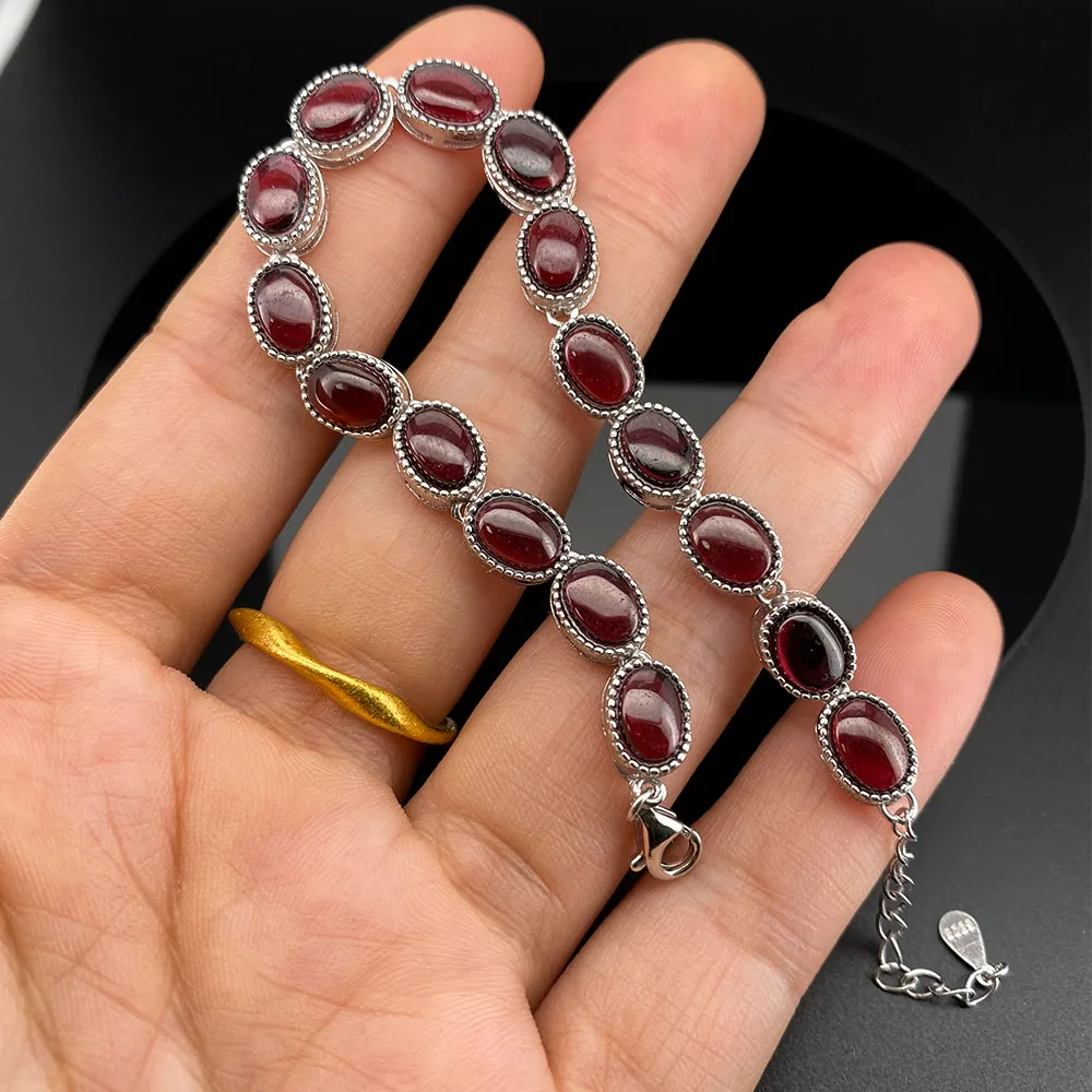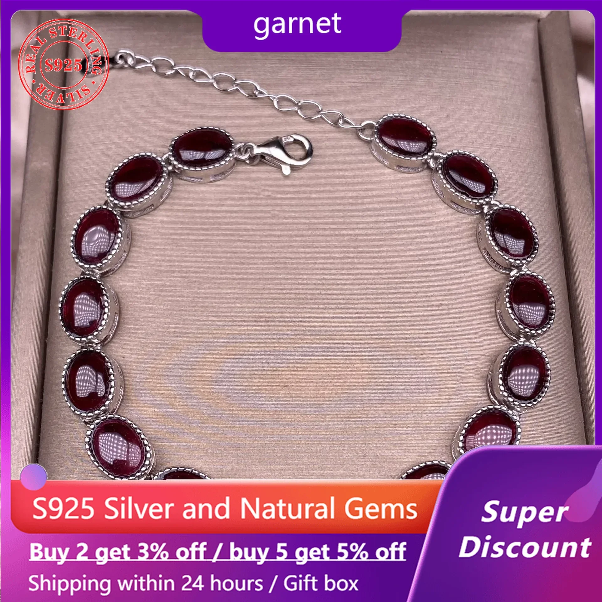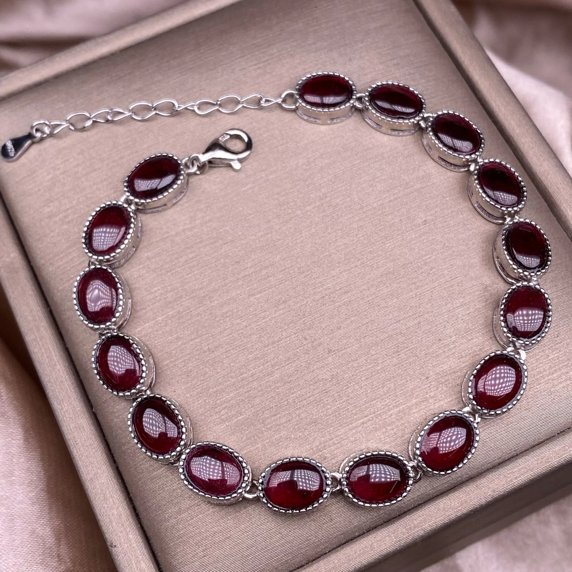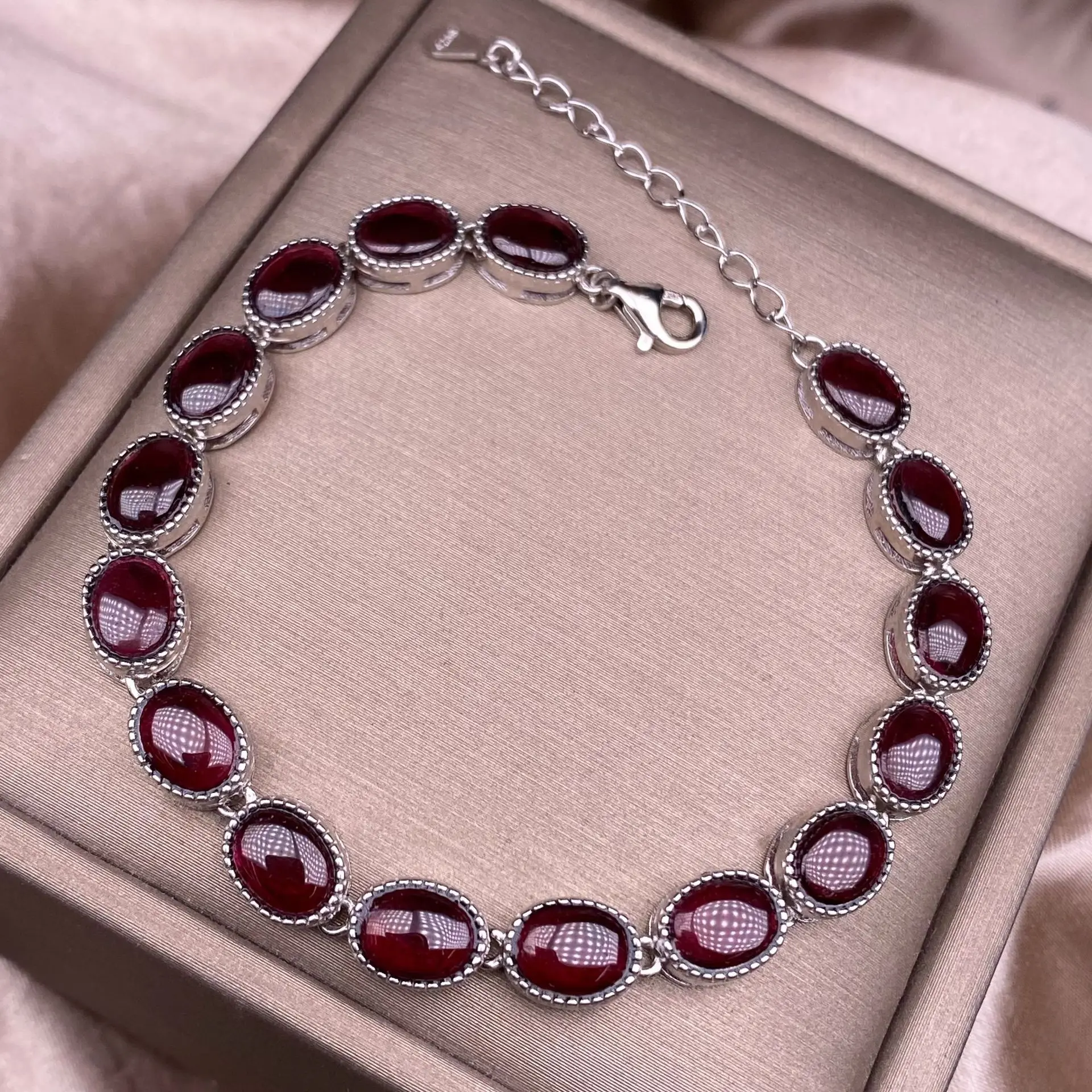 Esta pulsera está cuidadosamente elaborada con material de plata de ley 925 de alta calidad, con lÃneas de borde de plata suaves y delicadas que muestran una delicada artesanÃa.El granate elÃptico incrustado tiene un rico color rojo intenso, como una llama ardiente, con un fuerte impacto visual, agregando un color misterioso y encantador a la pulsera.