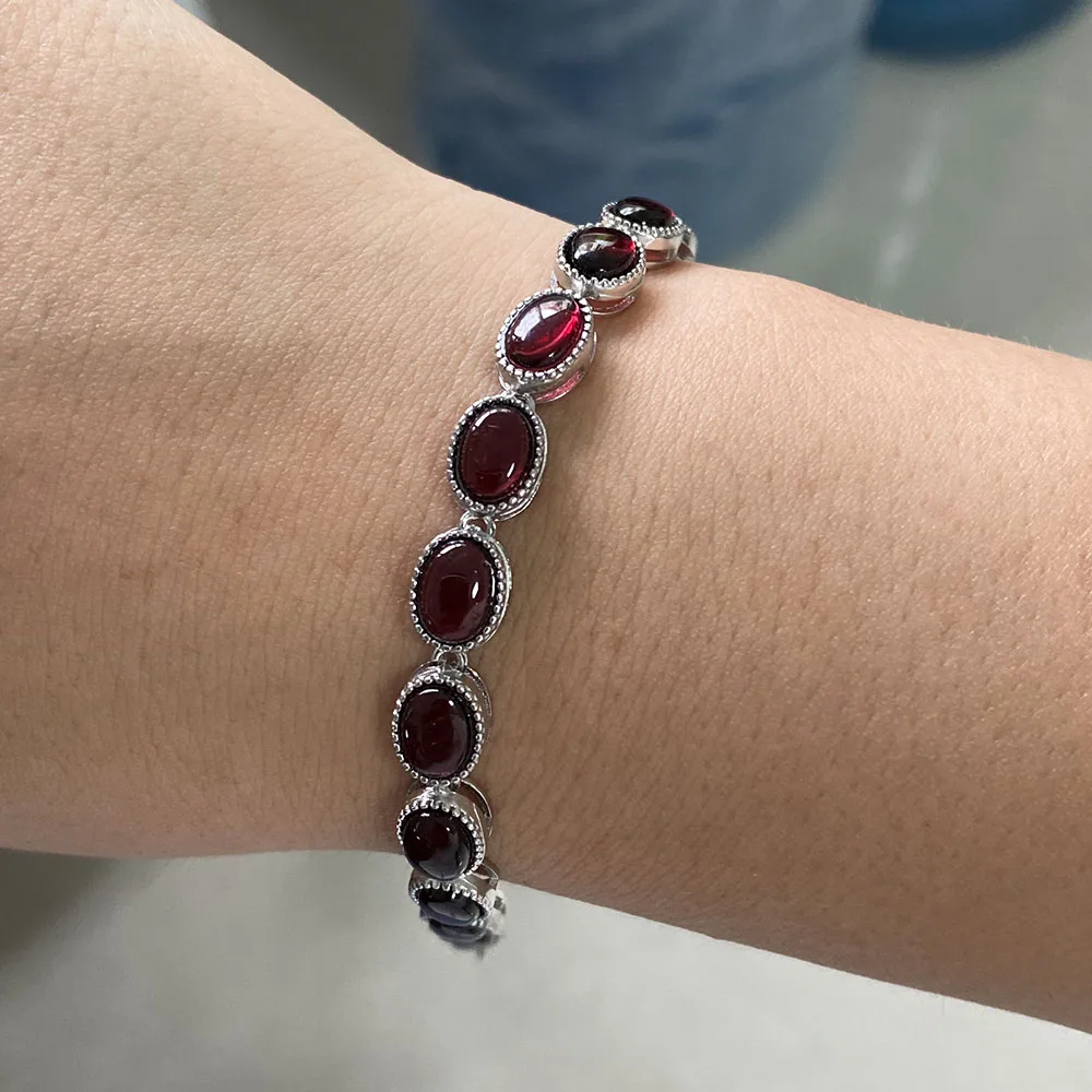 El estilo de diseño simple pero elegante lo convierte en una excelente opción para el uso diario.Ya sea combinado con ropa casual o atuendo formal, puede mejorar fácilmente el temperamento elegante general del atuendo.La cadena y la hebilla de la pulsera son de plata, formando un fuerte contraste con el granate, y la coordinación general es excelente.